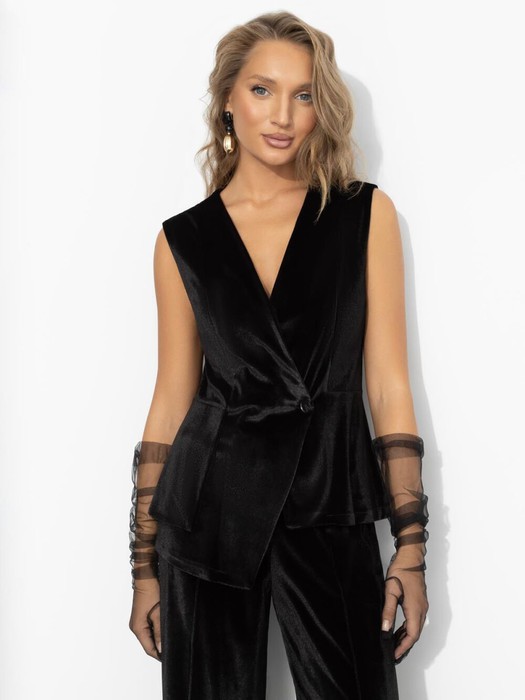 Бархатный жилет создан для женщины-кошки – той, что движется мягко, но уверенно, оставляя за собой след внимания и восхищения. Бархат мерцает при каждом шаге, подчёркивая изгибы и силу. Она не кричит о своей власти – она ею дышит. Этот образ манит, обещает и покоряет. Жилет асимметричного кроя с эффектом многослойности. Глубокий вырез и акцент на талии делают силуэт выразительным и утончённым.