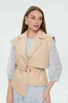 Жилетка женская утепленная с центральной застежкой на "молнию". Спинка со стяжкой. Перед с отрезными бочками и боковыми карманами "с листочкой". Воротник стойка с кулисой и шнуром из декорированной тесьмы. Низ жилетки округлой формы спереди короче, а спинка длиннее . Правый карман украшен нашивкой.