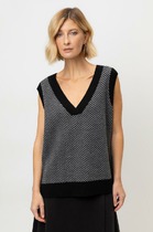 Жилет с центральной застежкой на петли и пуговицы, с втачным воротником с отрезной стойкой, с V-образным вырезом горловины. По переду с рельефами, выходящими из плеча до низа. Низ жилета фигурный. По рельефам переда- разрезы. Спинка со средним швом, рельефами, выходящими из плеча до низа.