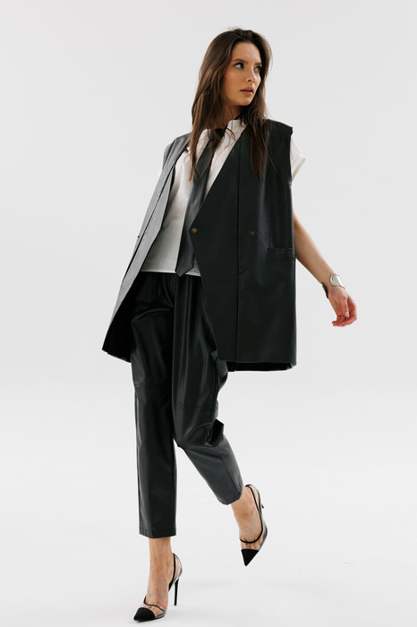 Жилет двубортный прямого кроя объёма оверсайз. Застёжка фигурная на кнопки. Карманы - листочки.
