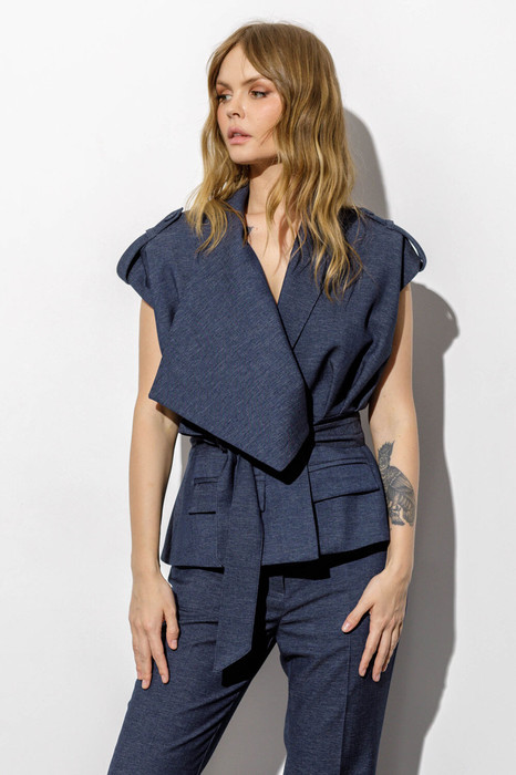 Приталенный жилет с асимметричным воротником из текстильной ткани под джинс (приобрести брюки с фото можно по арт. 6744).