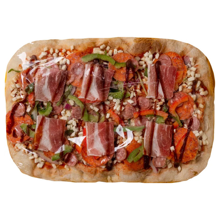Состав: основа для пиццы отпеченная, томатный соус, сыр с ЗМЖ, масло сливочное, белок молочный, перец болгарский, соус томатный барбекю классический, колбаски «Болгарские», экстракты из натуральных пряностей, бекон к/в из свинины, лук микс, изделие колбасное с/к колбаса п/с пепперони, колбасное изделие с/к колбаса п/с чоризо.