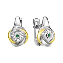 Серьги из золочёного серебра с изумрудом, фианитами и родированием