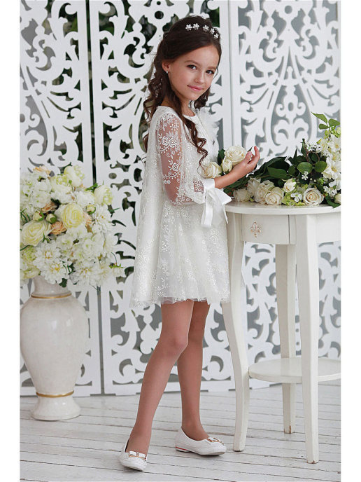 Очаровательное нарядное платье-трапеция для девочек. Верхний слой лифа и рукава выполнены из прозрачной сетки с нарядной цветочной вышивкой. Застежка пуговица на спинке. Манжеты на рукавах украшены атласными бантиками в тон изделия. Платье украшено воздушным цветком, что завершает великолепный образ.