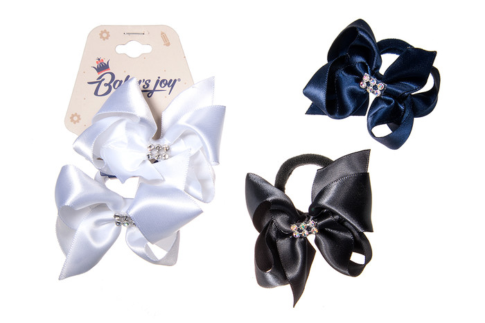 Бантик для волос, на резинке, парный. Выполнен из атласной ленты. Украшен стразами. Размер бантика 6 см.