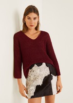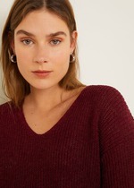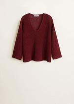 Свободная вязка. В состав входят хлопок и лен. V-образный вырез горловины. Длинные рукава. Спущенные плечи.