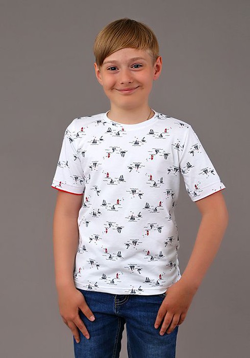 Футболка Орленок выполнена из трикотажа лакосты, который мягкий на ощупь, а в использовании прочный и дышащий. Горловина обработана бейкой, короткий рукав с необработанным краем, низ изделия подшит. Универсальная футболочка для любого занятия Вашего ребенка
