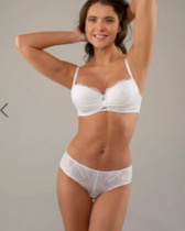 Изящная и нежная модель из кружева с витиеватым орнаментом в стиле барокко полностью в белом цвете. Отлетная деталь из нежного эластичного полотна по нижней части чашки бюста с пикантной прибранностью по грудке, закреплена в боковые швы чашки, которая переходит в пояс бюста, закрывает каркасную строчку, что придает изделию шарм и наделяет тонкой изюминкой. Дополнительная поддержка формируется за счет усиленных боковых деталей со стержнями и двойной мягкой эластичной сетки по боковым деталям. Маечный выход по спинке излюбленный технологический ход для комфорта при ежедневной носке