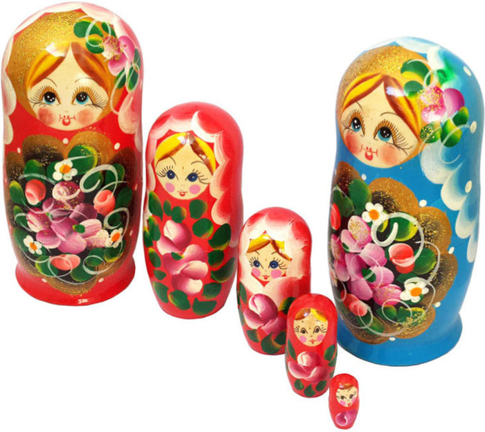 Самая большая матрешка высотой целых 16 см.(!),маленькая - чуть больше 4 см. Липа, гуашь, лак. Основной цвет (фон) у каждой матрешки свой: есть голубые, фиолетовые, темно-зеленые, розовые.