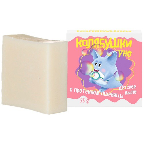 Детское мыло "Калябушки" с протеином пшеницы деликатно очищает детскую кожу с головы до кончиков пальцев.