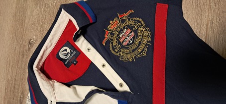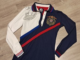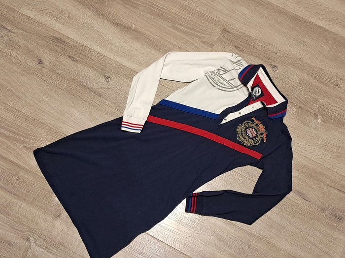Продается платье для девочки цвета триколор из хлопка. Размер S на рост 158 см (13 лет). Платье с длинными рукавами и воротником-поло. На груди вышивка с гербом. В отличном состоянии, без следов носки. Носили мало и аккуратно.