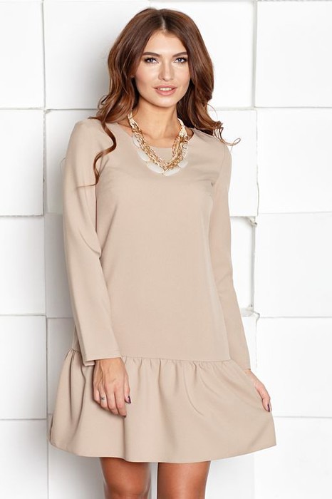 Платье из габардина прямого силуэта. Платье простого кроя, на полочке нагрудные вытачки. Вырез горловины круглый, не глубокий. Рукав втачной, длинный. В среднем шве спинки застежка на потайную молнию. Низ платья оформлен оборкой. Такой вариант покроя одежды наиболее универсален и подойдет любой фигуре.