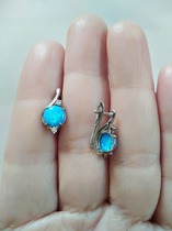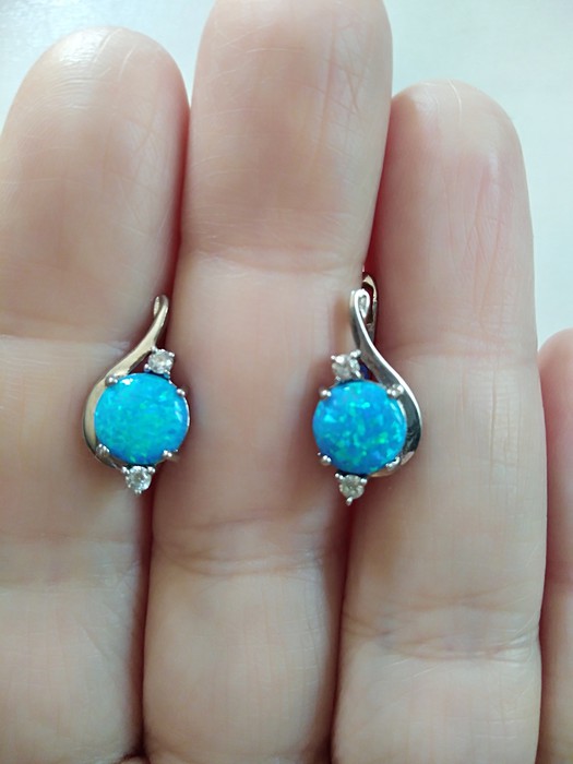 Серьги серебро 925 проба, покрытие родий, вставка синий опал с зелеными переливами и искорками) Вес около 4 грамм, бирочку не нашла. У одной серьги камень переливается, у другой мерцание без перелива, но это не очень заметно. Цвет на фото получился более светлый, на самом деле он синий, яркий.
