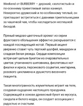 Классический аромат Weekend for Women от Burberry предлагает жительнице мегаполиса сменить жизненный темп, забыть о делах и посвятить долгожданные выходные себе. Композиция Weekend for Women способствует релаксации, воссоздавая прекрасную картину цветущего летнего сада. Яркие мандарины, красные цикламены, голубые ирисы и гиацинты парфюма Weekend for Women – все это пестрое разнообразие в окружении благородных оттенков кедра и чувственного мускуса восстановит силы и подарит превосходное настроение.